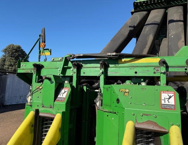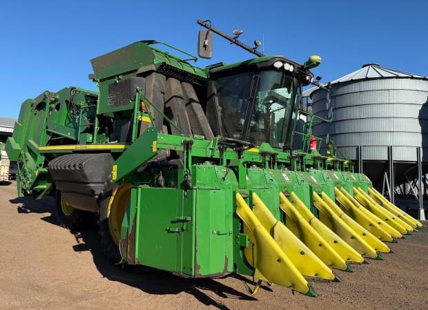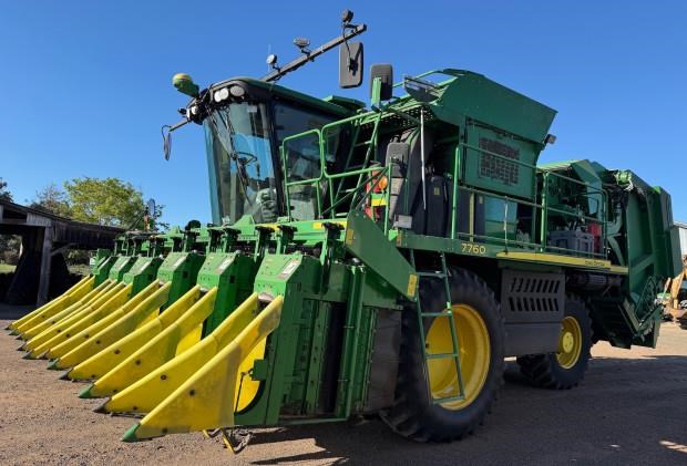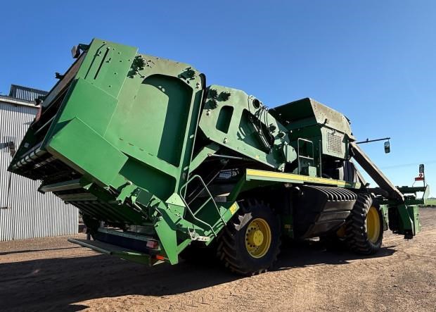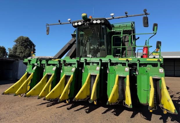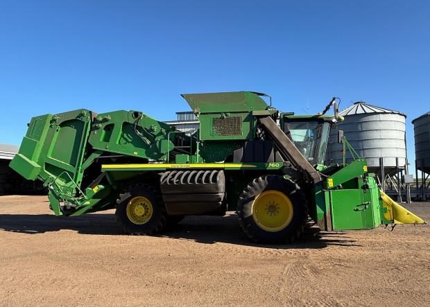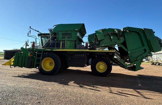 John Deere 7760 Cotton Picker, 2011 model, 6 row, 4166 fan hours, 6131 engine hours, LED lighting, guess row tracking, SF3000 receiver, heavy duty inside front rims, spares, bale counter, preseason required, one owner, spares, good condition, near Pampas QLD, includes GST