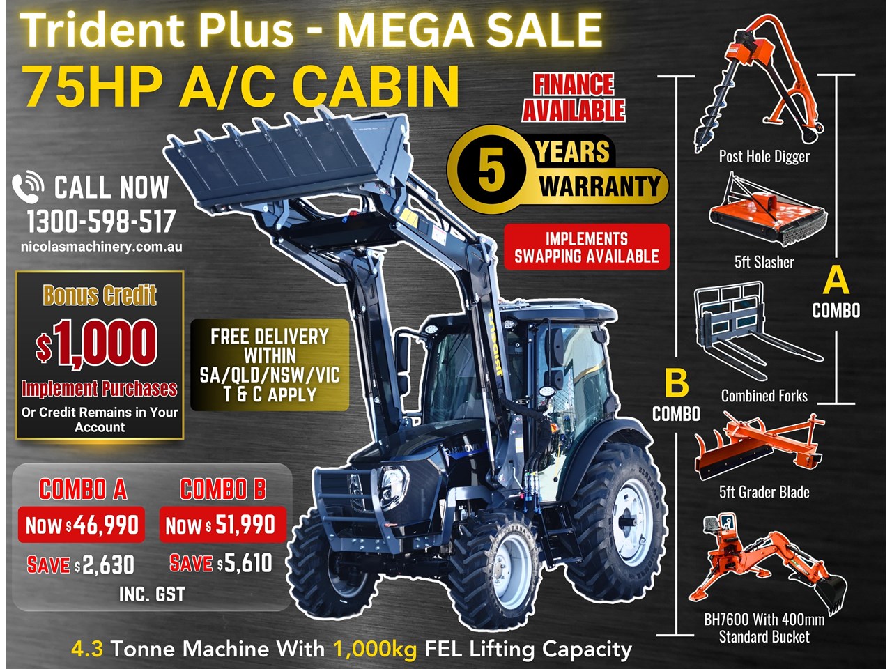 COMBO B: TRIDENT PLUS 75HP 4WD A/C cabin tractor with FEL 4in1 bucket + backhoe BH7600 with 400mm standard bucket + 5FT slasher + 5FT grader blade with ripper + post hole digger with 9 inch auger + combined forks (pallet + hay) for only $51,990 inc. GST