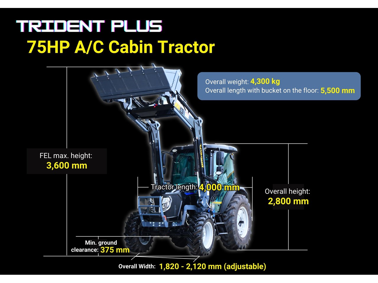 2025 TRIDENT PLUS SYNCHROMESH MODEL 75HP 4WD A/C CABIN TRACTOR WITH 4IN1 BUCKET COMBO DEAL 5 YEARS LABOUR AND PARTS WARRANTY AUSTRALIA WIDE DELIVERY & SUPPORT