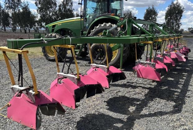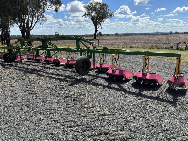 Custom Built Shield Sprayer, 12 metre width, folding toolbar, 3 point linkage attachment, stealth hoods for 1 metre rows, adjustable 3pl hitch, good condition, near Toowoomba QLD, includes GST